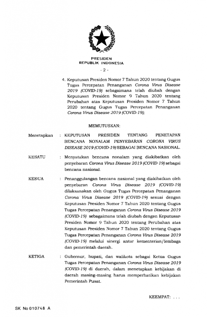 “Menyatakan bencana nonalam yang diakibatkan oleh penyebaran Corona Virus Disease 2019 (Covid-19) sebagai bencana nasional,” bunyi Diktum KESATU pada Keppres tersebut.