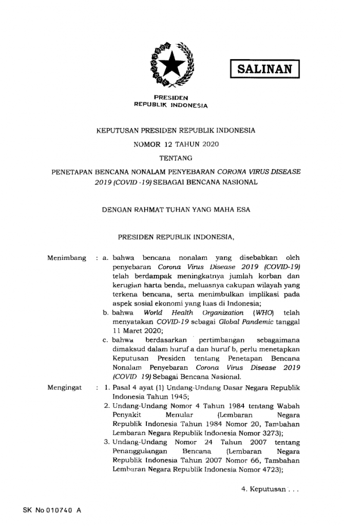 Untuk itu, Presiden Joko Widodo (Jokowi) menetapkan Keputusan Presiden (Keppres) Nomor 12 Tahun 2020 tentang Penetapan Bencana Nonalam Penyebaran Corona Virus Disease 2019 (Covid-19) sebagai Bencana Nasional.