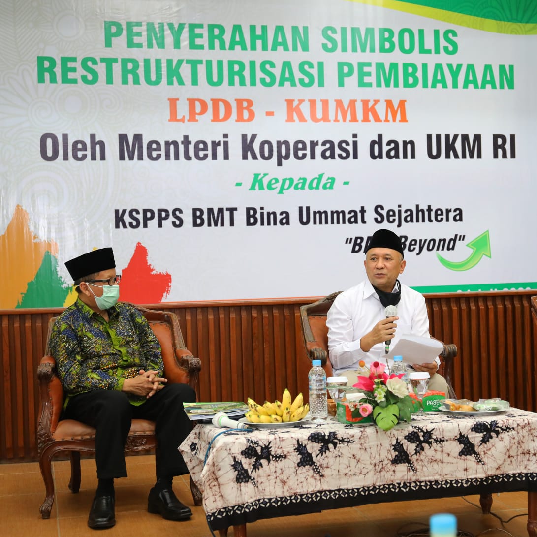 Menteri Teten juga menyerahkan secara simbolis restrukturisasi pembiayaan LPDB-KUKM kepada Koperasi Simpan Pinjam Pembiayaan Syariah Baitul Malwa Tamwil Bina Ummat Sejahtera (KSPPS BMT BUS) Kabupaten Rembang, Jawa Tengah.