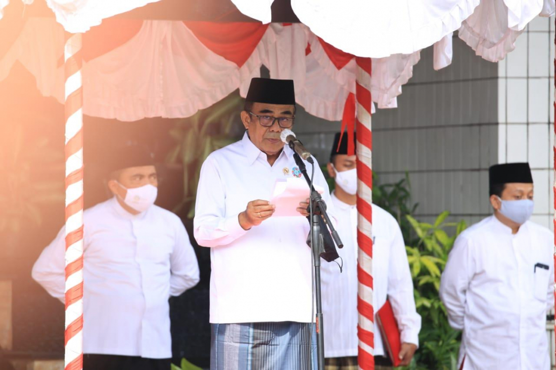 Menag menyampaikan amanat pada upacara Hari Santri 2020, di halaman Kantor Kemenag, Kamis (22/10). (Foto: Rikie/kemenag)