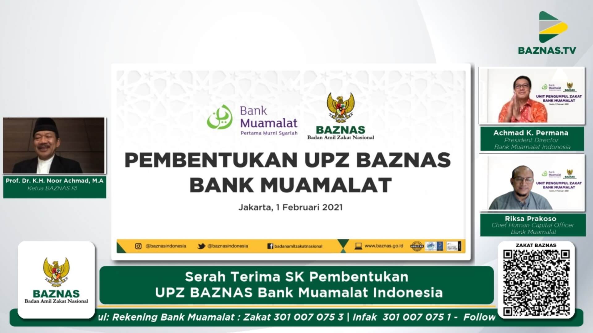 “Mudah-mudahan apa yang dilakukan Bank Muamalat selaras dengan visi dan misi BAZNAS, sebagai pilihan pertama pembayar zakat dan lembaga utama menyejahterakan umat. Keterlibatan para pimpinan Bank Muamalat di UPZ ini, akan menjadi contoh positif bagi pihak lainnya, sebagai bentuk kepedulian terhadap umat,” kata Noor.