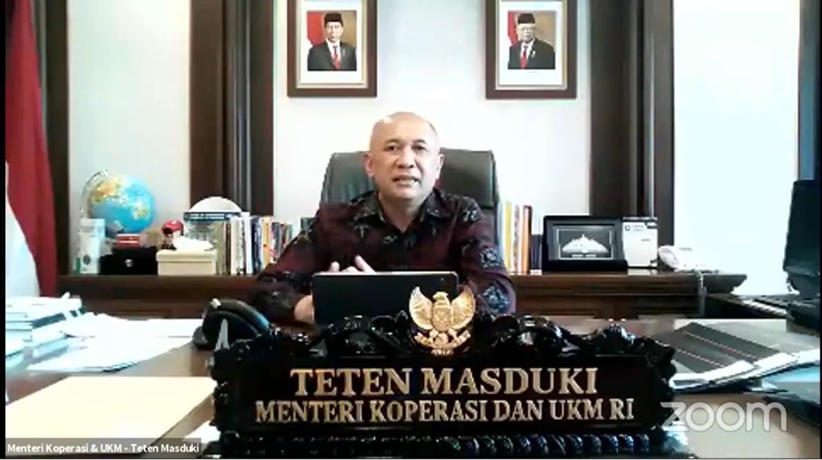 Teten Masduki saat menyampaikan sambutan dalam acara Konferensi 500k Eksportir Baru “Memacu Ekspor UKM, secara virtual (19/4/2021), berharap melalui ajang tersebut pelaku UKM dapat mendapatkan ilmu bagaimana menjadi eksportir, serta memacu ekspor melalui marketplace.