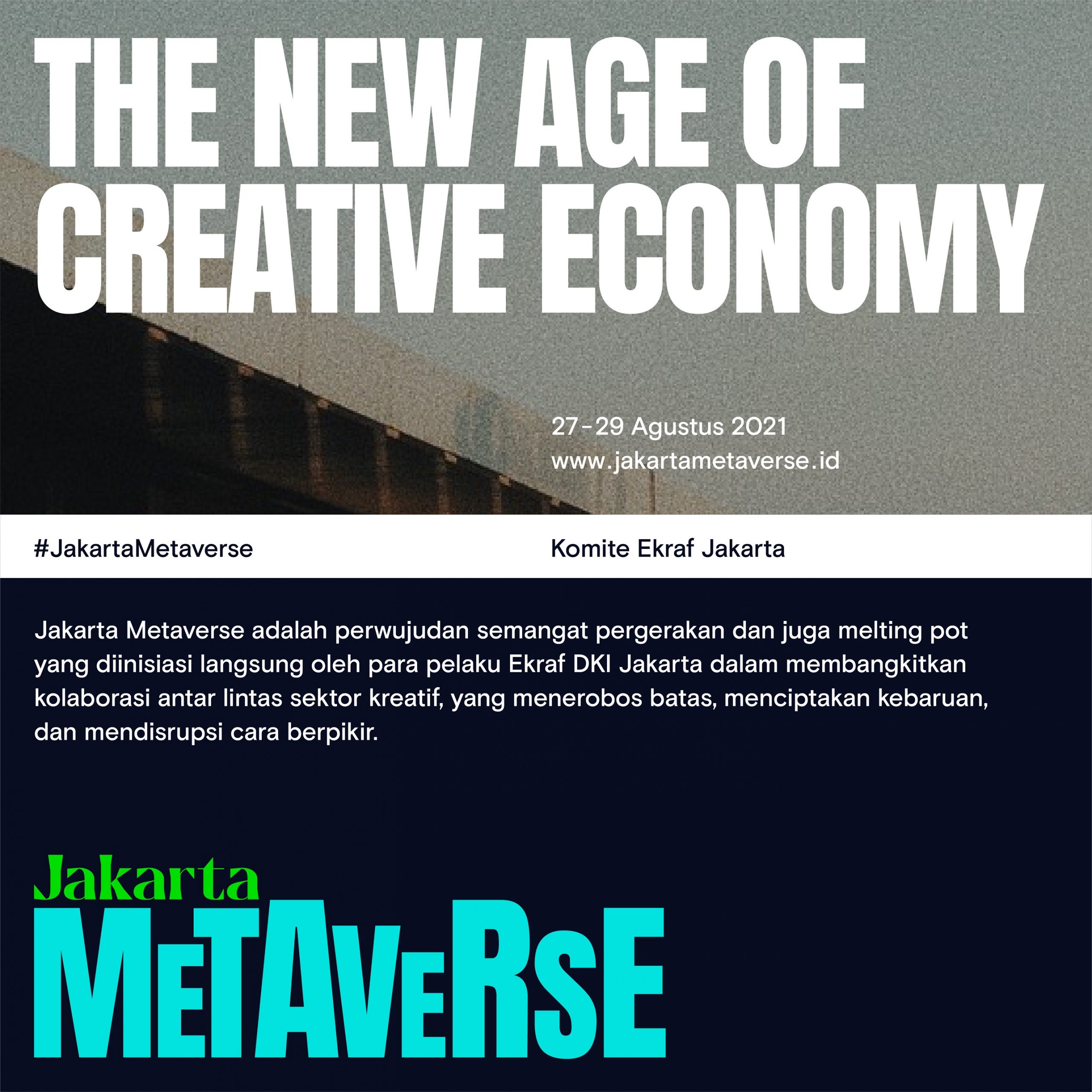 Situasi tersebut mendorong Komite Ekraf Jakarta (KE JKT) menggelar Jakarta Metaverse pada 27-29 Agustus 2021. Jakarta Metaverse merupakan sebuah semangat pergerakan dan juga melting pot yang diinisiasi oleh para pelaku ekraf Jakarta dalam membangkitkan kolaborasi lintas sektor kreatif, yang menerobos batas, menciptakan kebaruan, dan mendisrupsi cara berfikir.