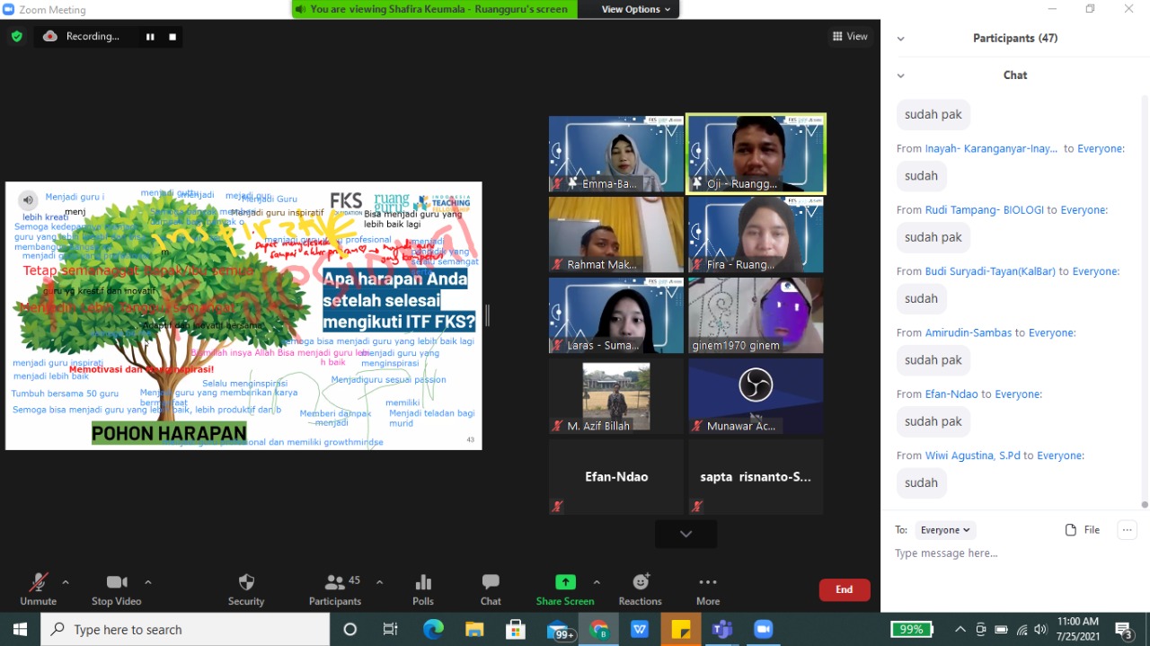 Program FKS ITF masih akan berlanjut hingga Juni 2022. Para peserta guru yang telah mendaftarkan diri diberikan akses Ruangbelajar for Teacher, di mana mereka dapat mengakses modul pelatihan berupa video pembelajaran, kuis, dan rangkuman. Selain itu, para peserta guru juga dibekali dengan kelas pengayaan virtual bersama fasilitator profesional, buku kerja berisi rangkuman materi dan latihan soal untuk memperdalam materi, serta mendapatkan layanan konseling.*