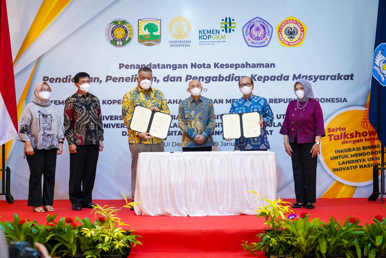 MADANINEWS.ID, Depok – Kementerian Koperasi dan UKM melakukan penandatanganan nota kesepahaman bersama Universitas Indonesia, Universitas Sumatera Utara, Universitas Andalas, Universitas Sam Ratulangi, dan Universitas Lambung Mangkurat agar dapat menciptakan entrepreneur baru yang dapat memperkuat ekonomi dan menciptakan lapangan kerja.