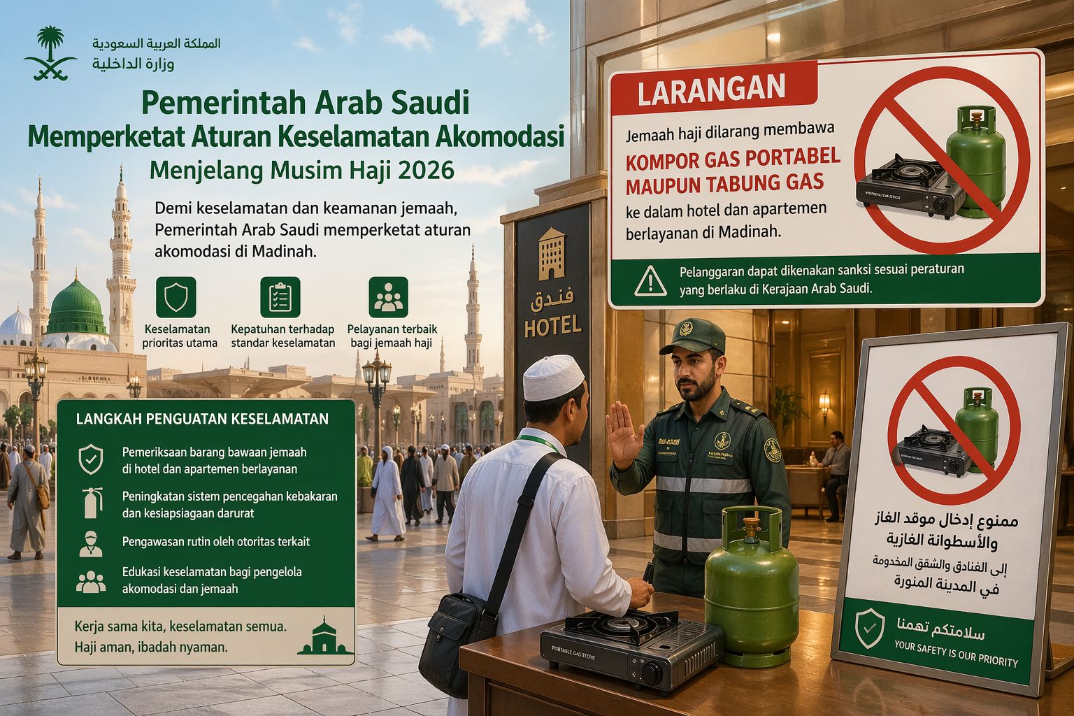 MADANINEWS.ID, MADINAH – Pemerintah Arab Saudi memperketat aturan keselamatan akomodasi menjelang musim haji 2026. Salah satu kebijakan yang diterapkan adalah larangan bagi jemaah haji membawa kompor gas portabel maupun tabung gas ke dalam hotel dan apartemen berlayanan di Madinah.