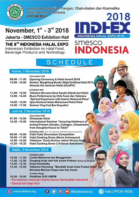 Sejalan dengan hal tersebut, Lembaga Pengkajian Pangan Obat-obatan dan Kosmetika Majelis Ulama Indonesia (LPPOM MUI), berencana menyelenggarakan pameran halal internasional Indonesia Halal Expo (Indhex) 2018 pada 1 – 3 November 2018, di gedung Smesco Convention Hall, Jl. Gatot Subroto, Jakarta.