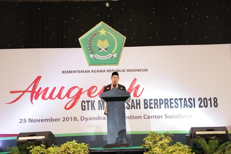“Mari kita senantiasa menjaga rasa cinta kepada diri. Hanya dengan cinta, kita bisa mendidik anak-anak, tidak dengan amarah dan murka,” kata Menag di hadapan ribuan guru madrasah di Malam Puncak Anugerah Guru Tenaga Kependidikan (GTK) Madarasah yang bertepatan dengan Hari Guru Nasional ke 73 di Dyandra Covention Hall, Surabaya, Minggu (25/11) malam.