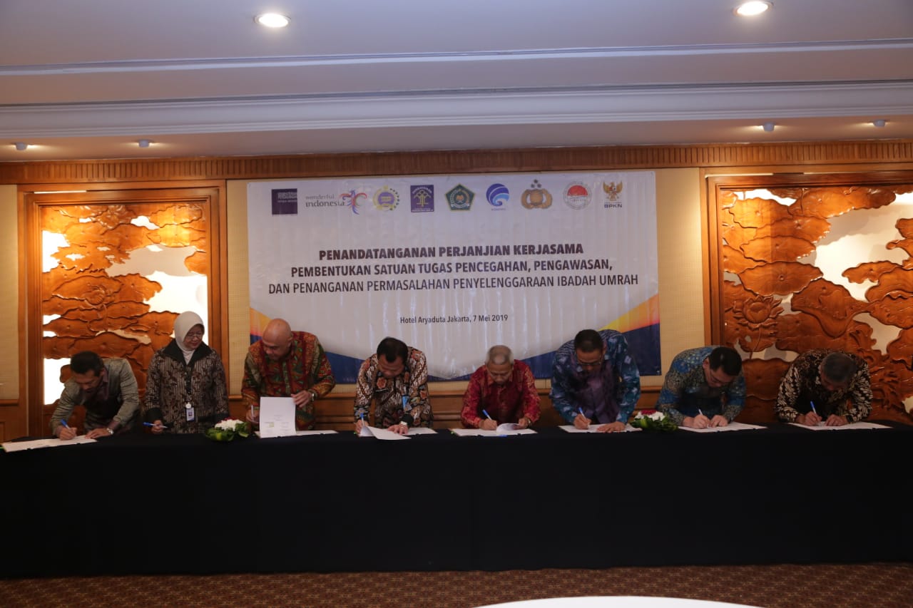 Penandatangan perjanjian kerja sama tersebut dilakukan oleh Dirjen Penyelenggaraan Haji dan Umrah Kemenag, Dirjen Protokol dan Konsuler Kemenlu, Dirjen Aplikasi Informatika Kominfo, Dirjen Imigrasi Kemenhum dan HAM, Dirjen Perlindungan Konsumen dan Tata Tertib Niaga Kemendag, Deputi Bidang Pengembangan Industri dan Kelembagaan Kemenpar, Asisten Kapolri Bidang Operasi Kepolisian Negara RI, Deputi Bidang Pemberantasan PPATK, Koordinator Bidang Kelembagaan dan Kerjasama BPKN di hotel Aryaduta Jakarta, Selasa (7/5/2019).