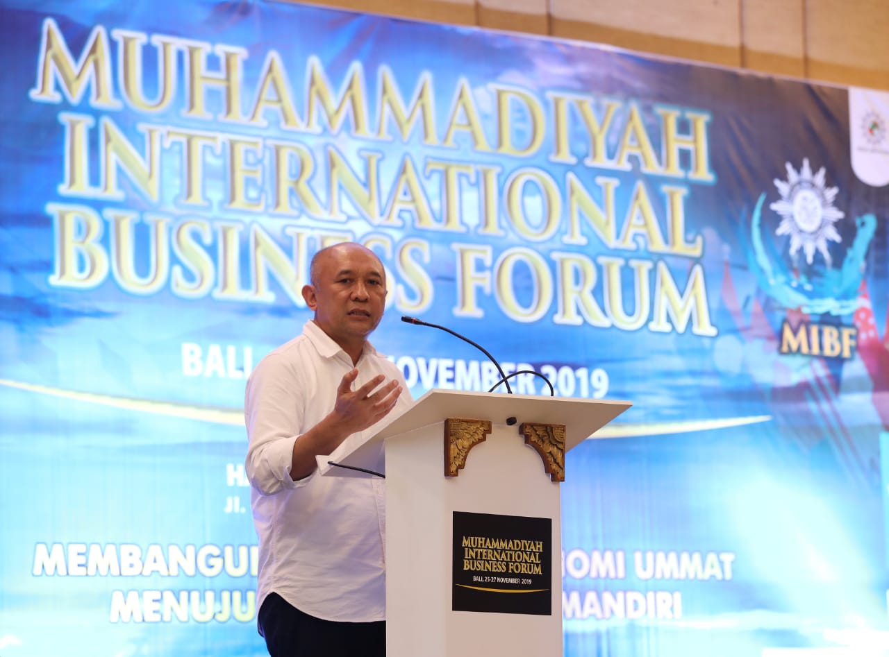 Menteri Koperasi dan UKM Teten Masduki memberikan sambutan menandai dibukanya acara Muhammadiyah International Business Forum di Denpasar, Bali. Senin (25/11/2019).