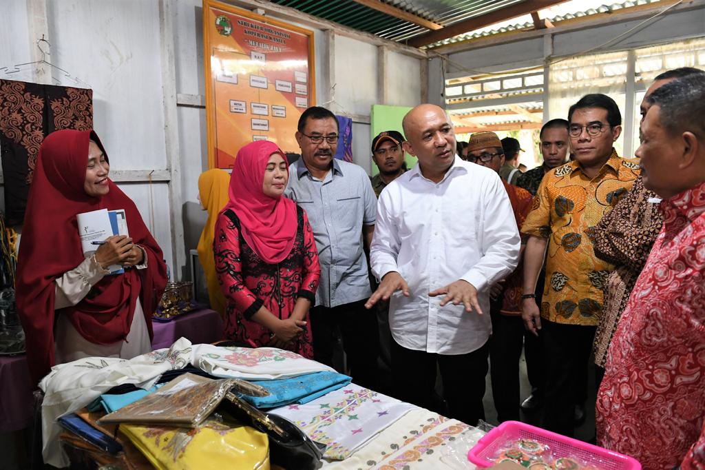 Menteri Koperasi dan UKM Teten Masduki meninjau Kopwan Metalik Jaya di Bunggalo, Telaga Jaya, Gorontalo, Minggu (29/12/2019) yang memproduksi kain khas Karawo.