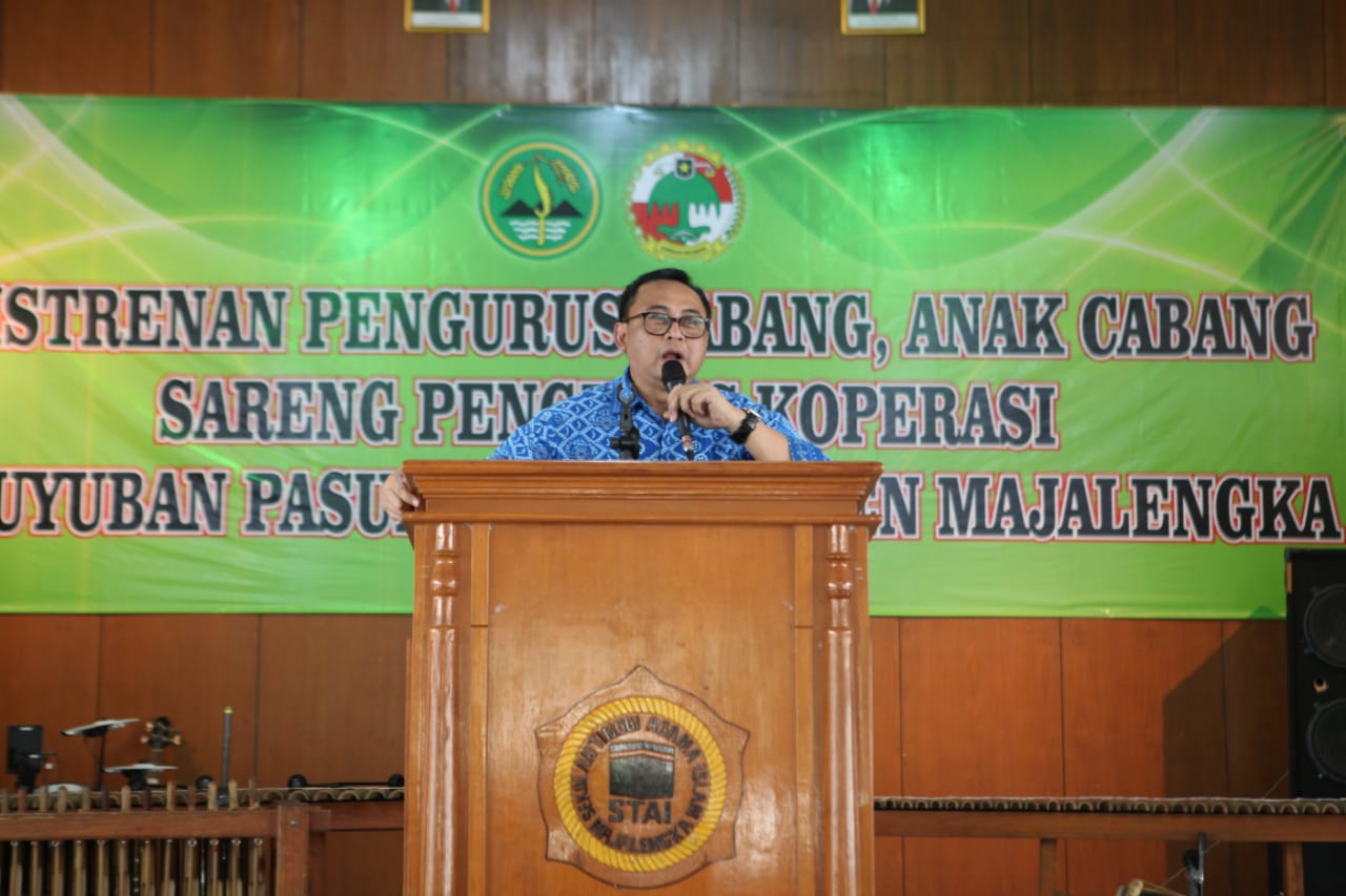 Sekretaris Kementerian Koperasi dan UKM Rully Indrawan dalam memberikan sambutan peresmian dan pengukuhan pengurus koperasi paguyuban kabupaten Majalengka, Sabtu (1/2/2020)